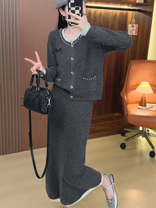 法式小香风钉珠设计款毛衣两件套秋冬新款高腰半身裙针织衫套装女
