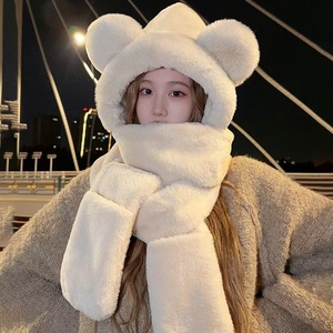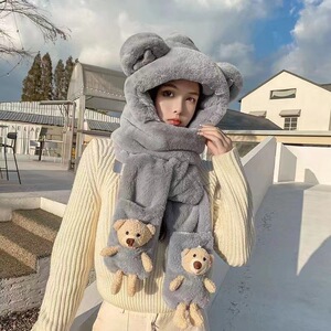 小熊帽子秋冬女围巾大头围围脖手套一体连帽可爱保暖冬天三件套潮