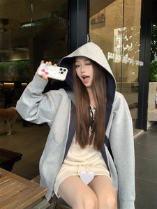 美式复古撞色连帽拉链卫衣外套女秋季休闲宽松开衫慵懒风灰色上衣