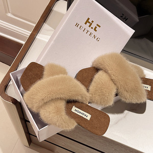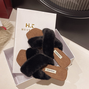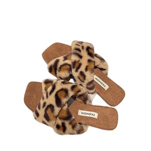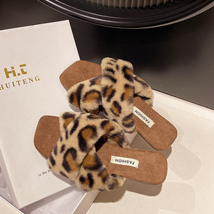 复古豹纹方头毛毛鞋女外穿2025秋季新款毛绒绒交叉棉拖鞋大码拖鞋