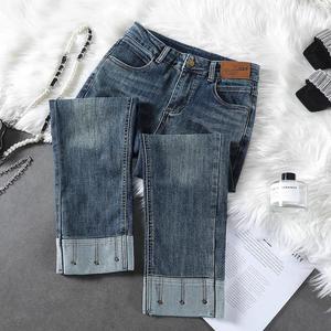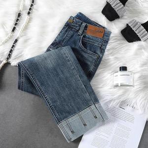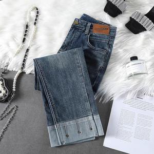烟管裤女2025秋秋装新款高腰显瘦早秋拼接卷边直筒牛仔裤法棍裤