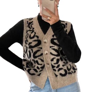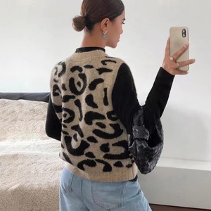 跨境韩版v领豹纹开衫毛衣女秋冬新款设计感小众叠穿上衣针织马甲