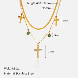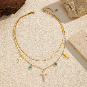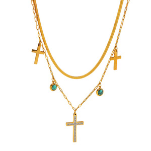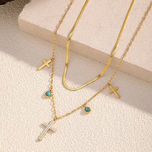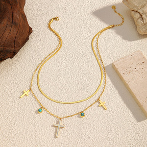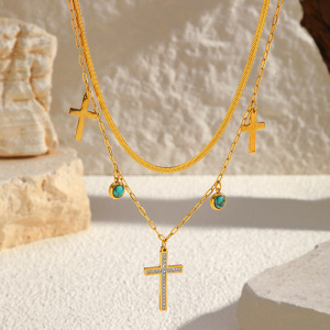 欧美跨境钛钢十字架绿松石双层项链套装女式锁骨链不锈钢项链饰品