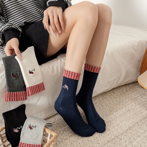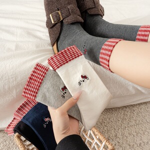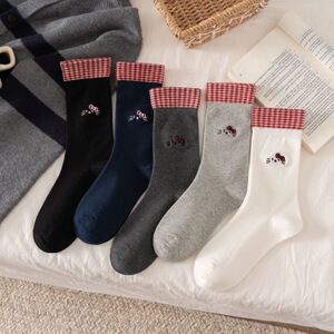 无骨翻边秋季新款女袜子中筒袜ins潮卡通刺绣小猫格子花边堆堆袜