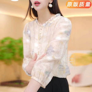 新中式轻国风上衣女士夏季薄款七分袖小衫木耳边印花法式雪纺衬衫