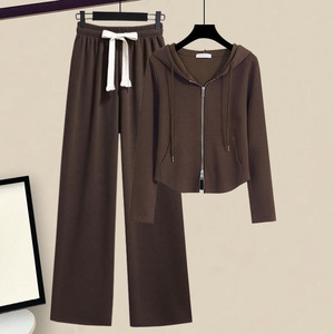 秋季休闲百搭连帽两件套套装慵懒风时尚套装女显瘦阔腿裤拉链卫衣