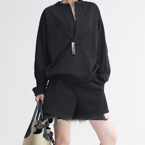 Amyy 棉混纺蝙蝠袖设计微廓型半开襟套头卫衣上衣+短裤宽松显瘦
