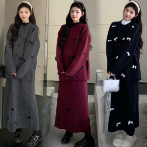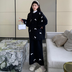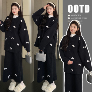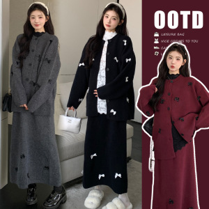 现货秋冬加厚孕妇套装慵懒韩系蝴蝶结长袖毛衣外套+孕妇半身裙