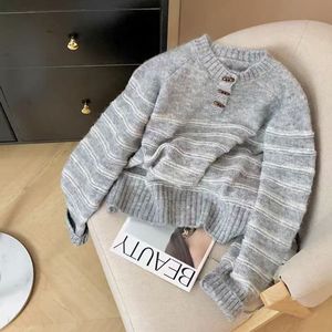 韩系牛角扣圆领套头毛衣女装秋冬温柔风条纹提花慵懒风针织衫上衣
