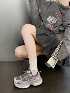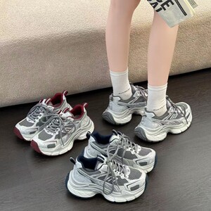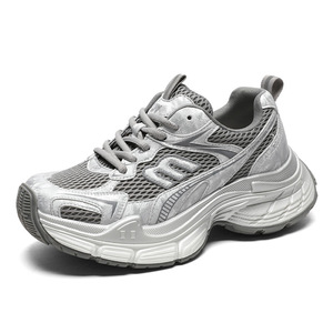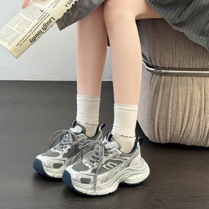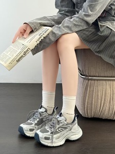2025新款厚底老爹鞋女款百搭拼色网面透气轻便运动显脚小银灰色