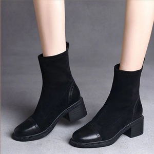 弹力瘦瘦靴女秋冬加绒加厚2025新款软皮拼接小裸靴中跟粗跟中筒靴