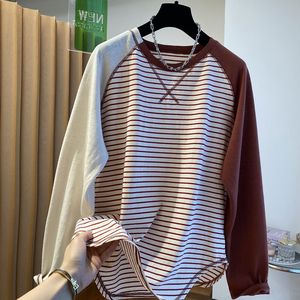 2025秋冬高级感条纹拼色长袖t恤男女大码宽松显瘦空调衫圆领上衣
