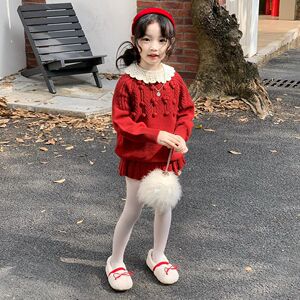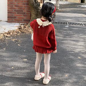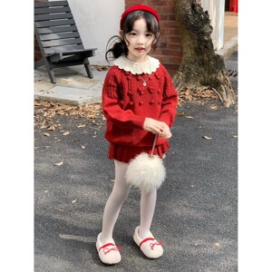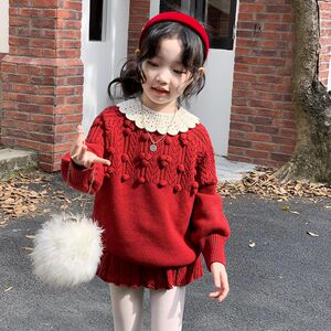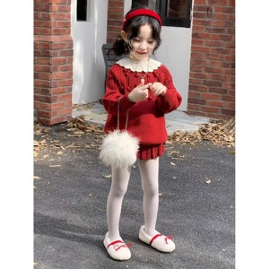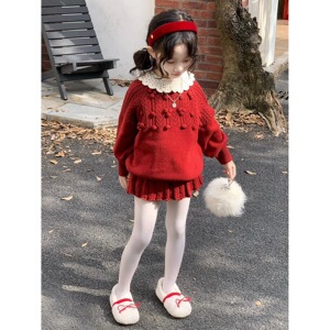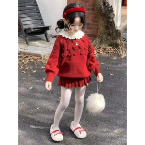韩版女童2025秋冬新款红色针织套装女宝宝镂空球球毛衣短裙两件套