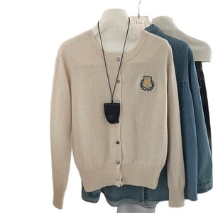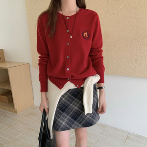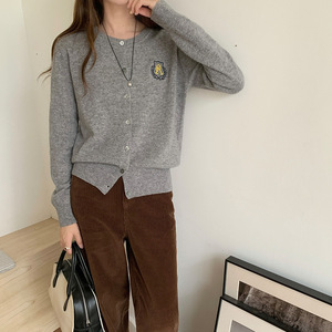 秋冬新款刺绣徽章设计100纯羊毛针织开衫经典纯色女士圆领外套潮