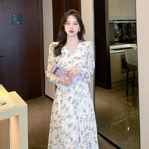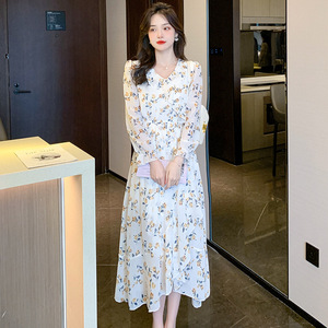 长袖雪纺碎花连衣裙女2025秋季新款脚踝仙气森系气质长款仙女裙子
