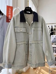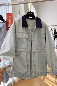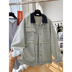 高级感复古做旧撞色巴恩风翻领宽松慵懒风韩系牛仔外套女春秋夹克