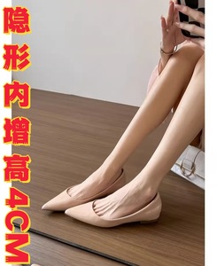 现货~33-43码内增高4cm法式裸色尖头单鞋女平底浅口气质玛丽珍鞋