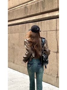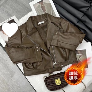 欧货翻领短款pu皮外套女加绒春秋新款感机车炸街小个子皮夹克
