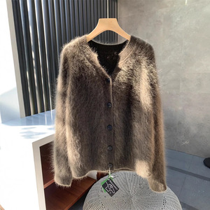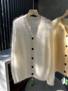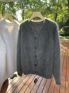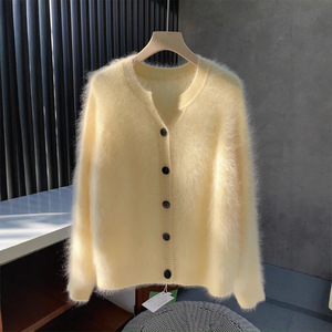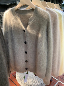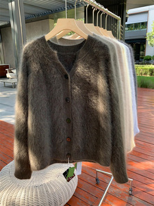 金漳服饰 清岛精3D无缝一体拉毛5山羊绒圆领开衫女拉绒毛衣上衣