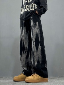 黑色扎染牛仔裤春秋男款潮牌痞帅炸街微喇裤美式drill直筒弯刀裤