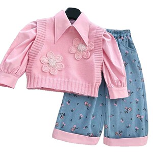 新款2025秋季女童套装爆款春秋季洋气时髦马甲衬衫牛仔裤三件套潮