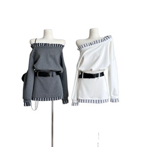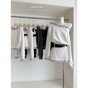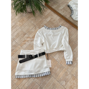 秋上新!拼接撞色露肩卫衣半身裙休闲套装女