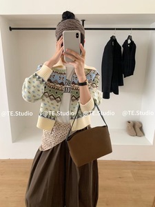 秋冬季复古短款费尔岛翻领拉链针织开衫女长袖提花毛衣外套上衣潮