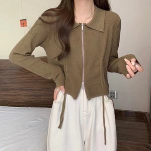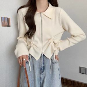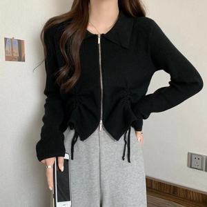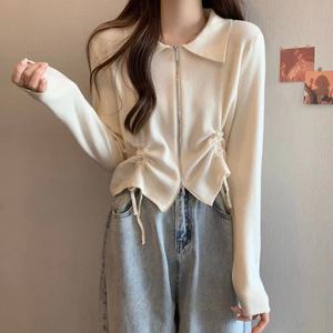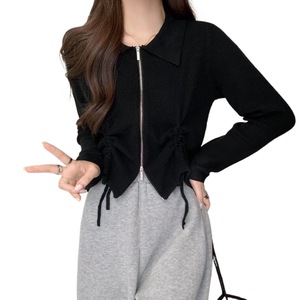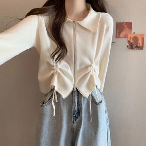 2025秋季新款polo领韩版翻领拉链打底T恤抽褶百搭针织开衫上衣女