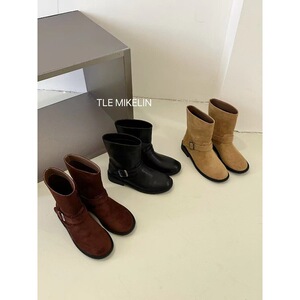 TLEMIKELIN韩国ins博主穿搭短靴圆头粗跟百搭套筒西部靴