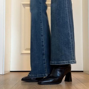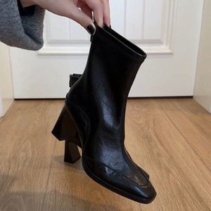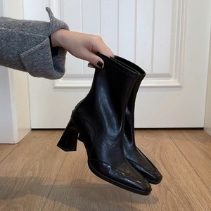牛皮版~韩系真皮粗跟方头小短靴复古弹力瘦瘦靴女后拉链高跟单靴