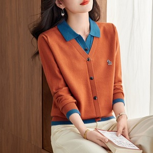 2025春秋新款时尚洋气翻领针织打底衫假两件上衣女衬衫领毛衣