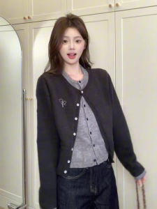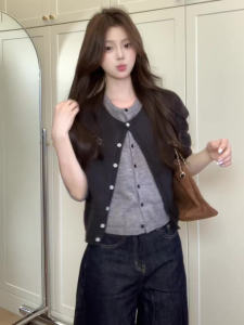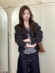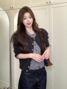 韩系假两件撞色设计感针织开衫女春秋季修身减龄休闲短款毛衣外套