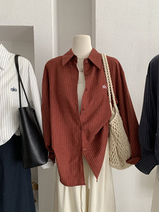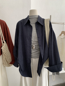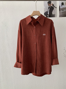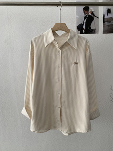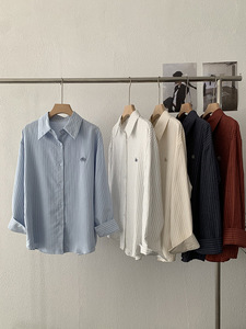 欧玛莱 刺绣字母翻领单排扣长袖竖条纹中长款衬衫上衣韩系女 4612