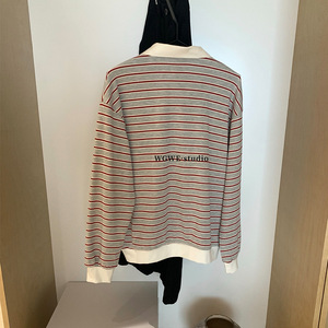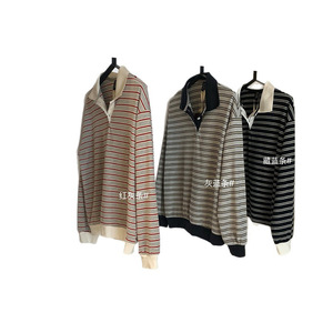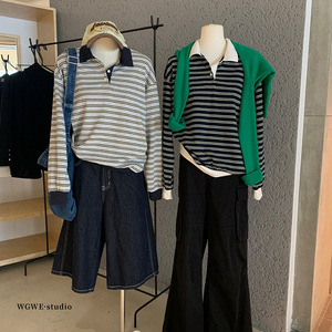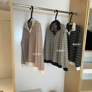 WGWE6965韩系学院风休闲条纹撞色polo长袖t恤上衣