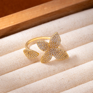 铜镀锆石跨境热卖欧美时尚个性微镶树叶满钻热销同款开口锆石戒指