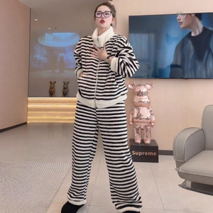 2025新款睡衣女冬季加绒加厚连帽条纹珊瑚绒家居服套装冬天可外穿