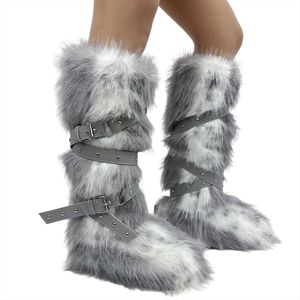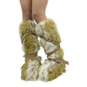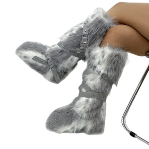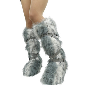 2025新款仿皮草豹纹高筒绑带毛毛靴子女亚文化毛绒铆钉厚底雪地靴