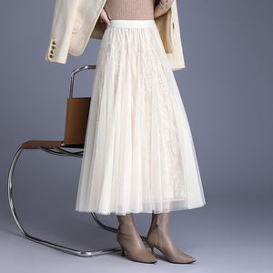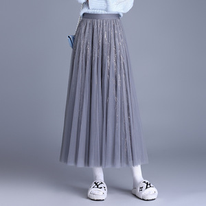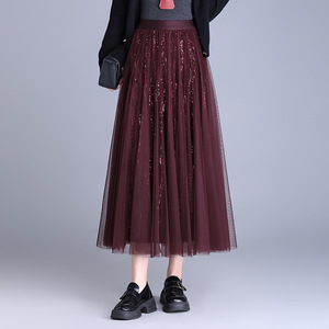 2025秋季压褶亮片网纱半身裙女高腰a字百褶裙显瘦中长大摆裙