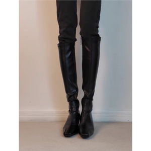 羊皮版~欧美方头长靴不过膝高筒骑士靴女款坡跟侧拉链瘦瘦靴简约