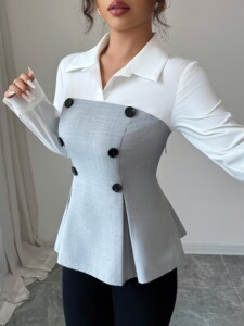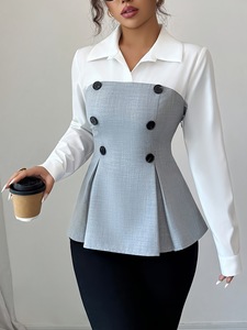 现货 跨境欧美码女士优雅长袖撞色收腰双排扣修身秋季衬衫