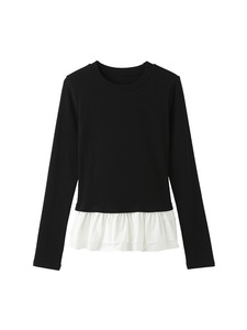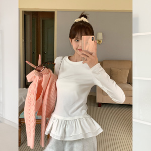 宋正恩芭蕾风花边黑色长袖t恤女秋季新款加绒修身内搭打底衫上衣