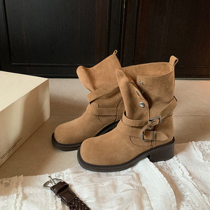 牛皮版~2025秋冬新款美拉德翻折两穿西部靴女牛反绒中筒靴马丁靴