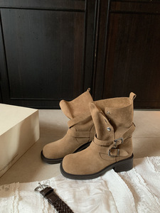 现货版~2025秋冬新款废土风圆头粗跟马丁靴女皮带扣西部短靴女靴