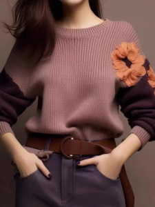 多巴胺秋季穿搭高级感微胖正肩紫色重工钩花朵拼接美式慵懒大毛衣