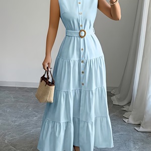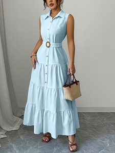 现货 跨境欧美码女士优雅纯色长款无袖衬衫裙配腰带连衣裙