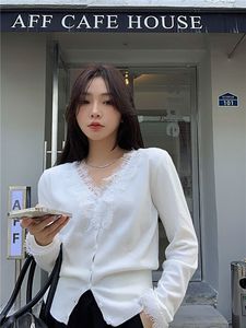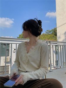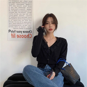 早秋甜辣蕾丝拼接针织开衫女法式大衣内搭高级感毛绒打底衫上衣冬