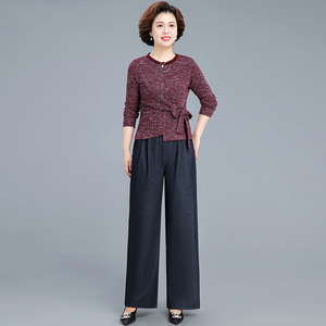 秋款不对称文艺复古民族风气质拼接T恤两件套工艺高腰阔腿裤套装