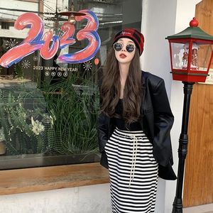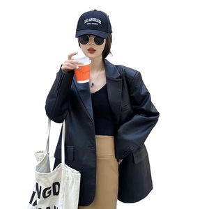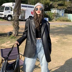 中长款黑色皮衣西装外套女宽松2025春秋新款PU皮感炸街西服女