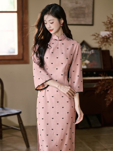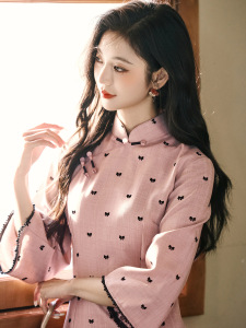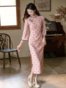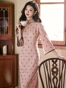 洛士博新中式粉色改良旗袍2025新款秋季连衣裙少女长袖日常可穿