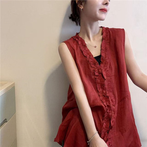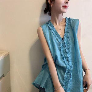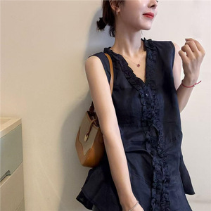 2025夏季新款V领边拼接衬衣女上衣无袖洋气背心百搭显瘦T恤